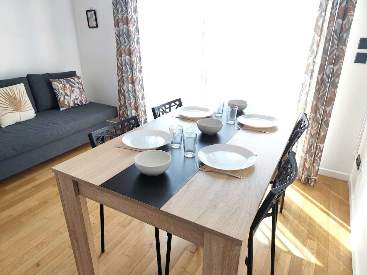 Appartement lumineux et confortable de type T3, idéal pour familles, groupes ou séjours professionnels. Situé en rez de chaussée, il dispose de deux chambres avec des lits confortables, d’une très grande salle de douche moderne et fonctionnelle, ainsi que d’un grand salon et d’une salle à manger accueillante. La cuisine est entièrement équipée pour préparer vos repas en toute simplicité.