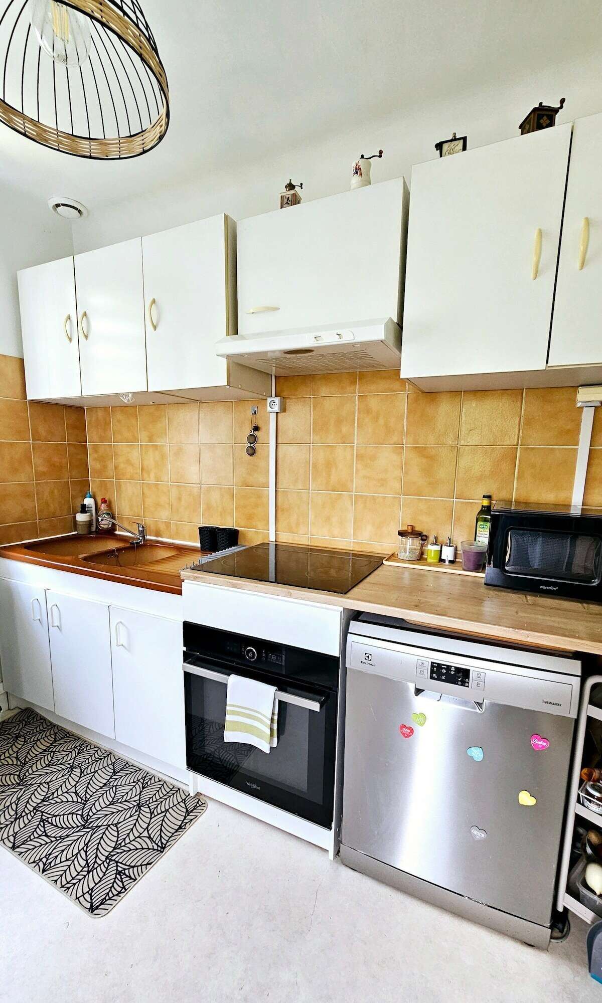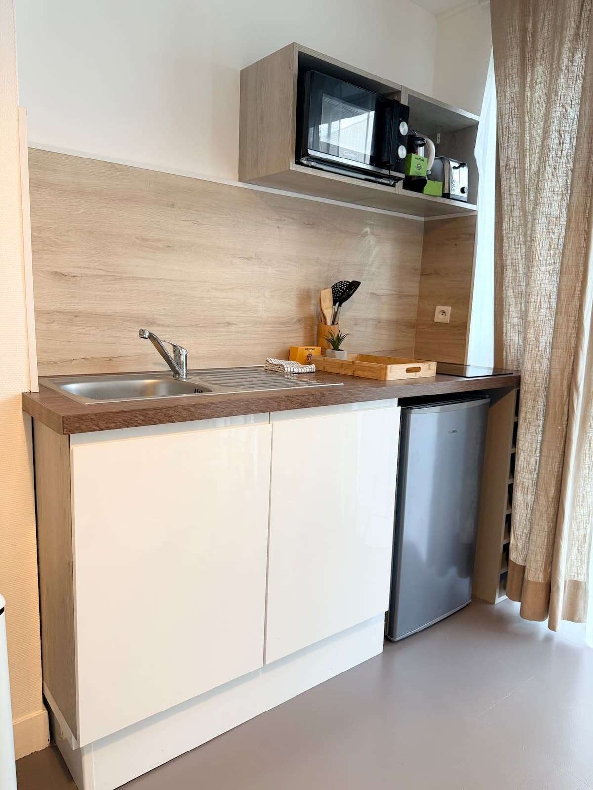 Cuisine équipée, micro onde, four, machine à café, bouilloire, vaisselle…
