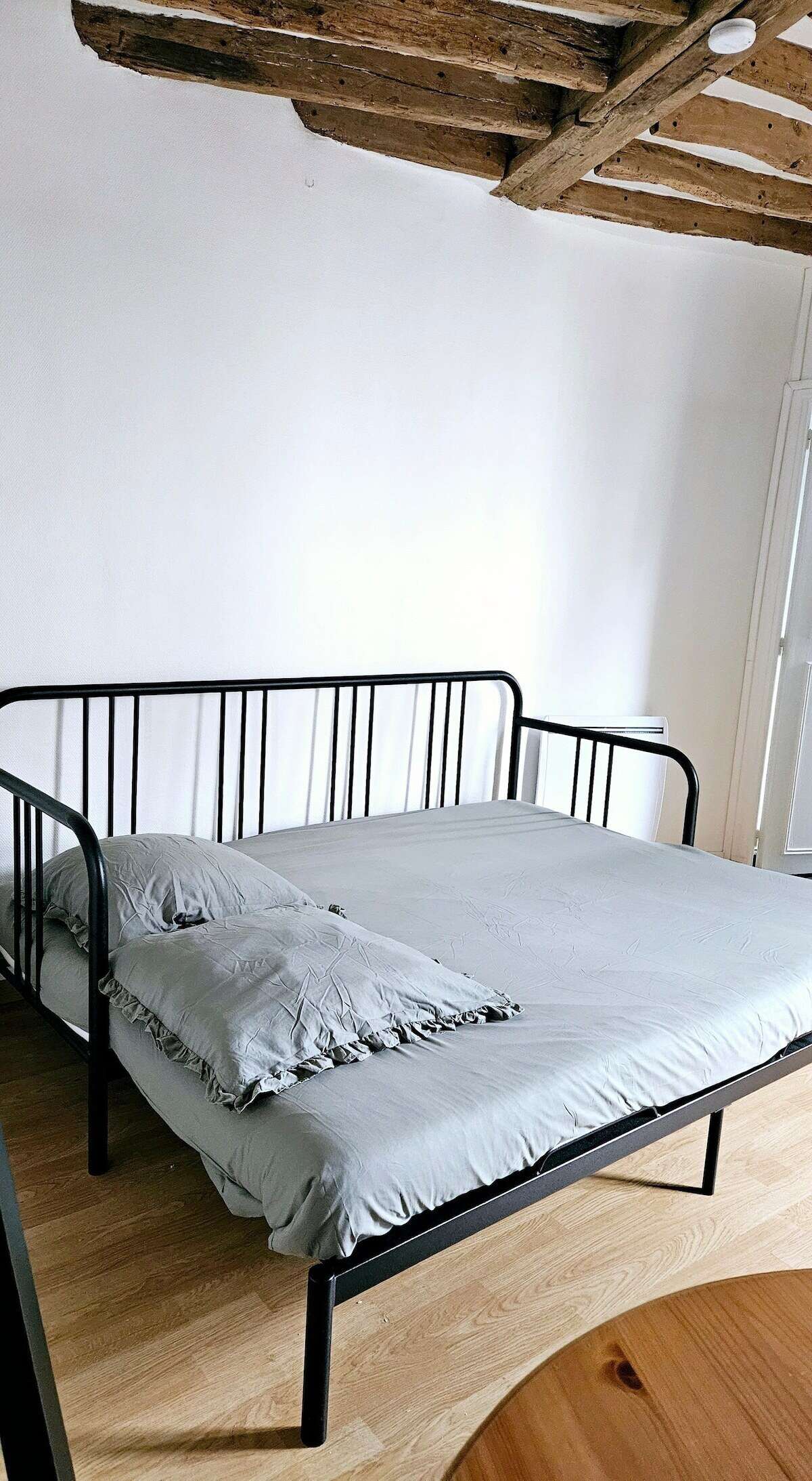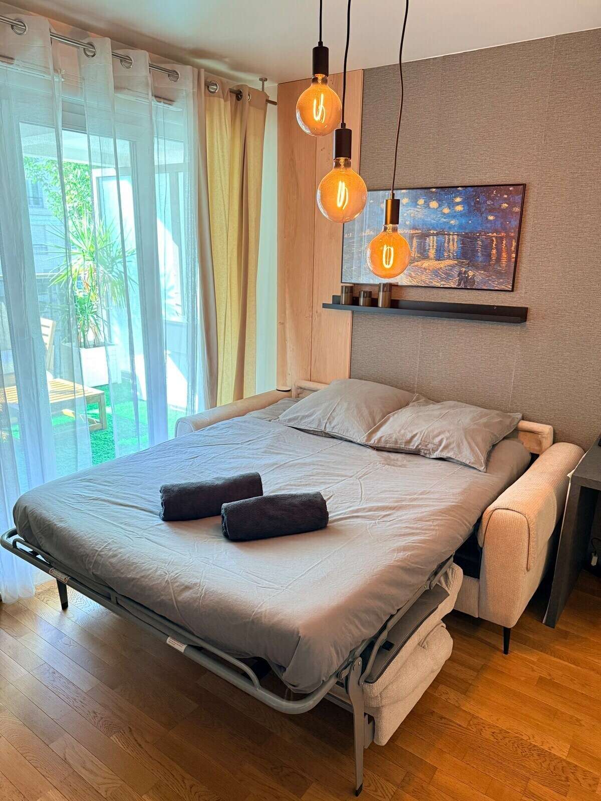 Imaginez un charmant studio baigné de lumière avec un canapé lit confortable pour se détendre en fin de journée et un coin nuit douillet séparé par une verrière accueillant un lit double.