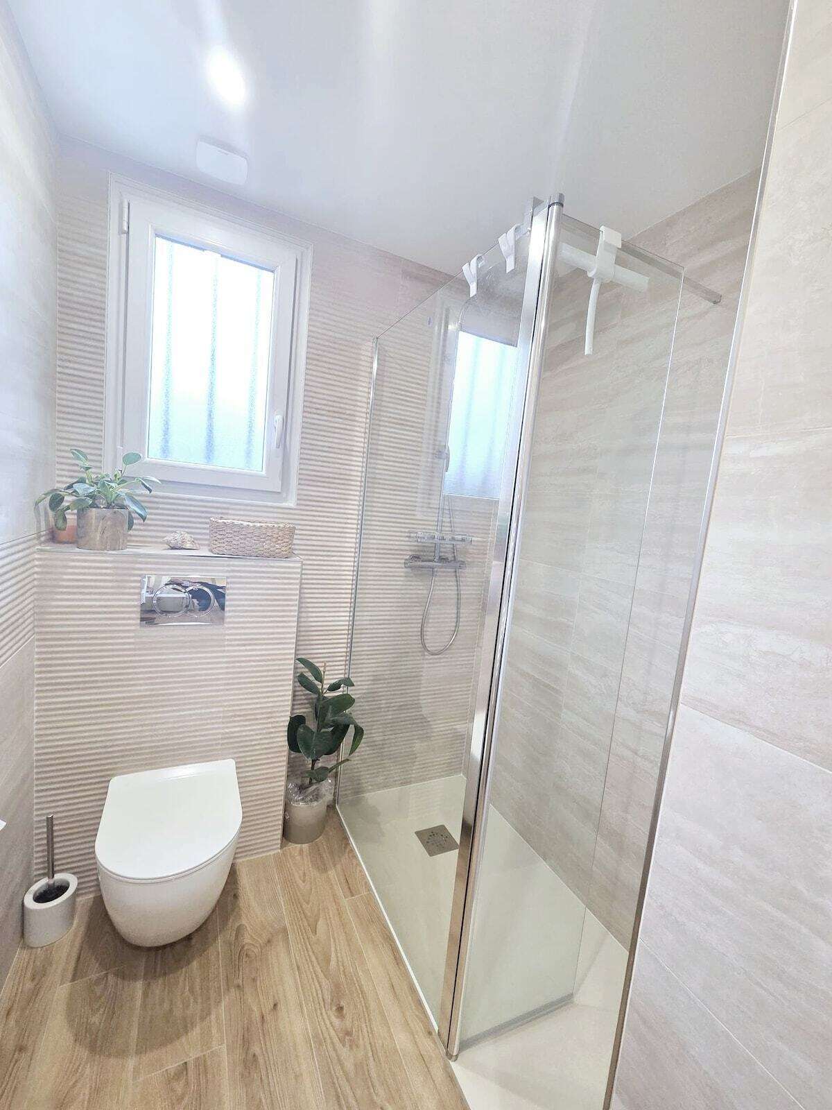 Salle de bain spacieuse avec gel douche et shampooing à votre disposition
