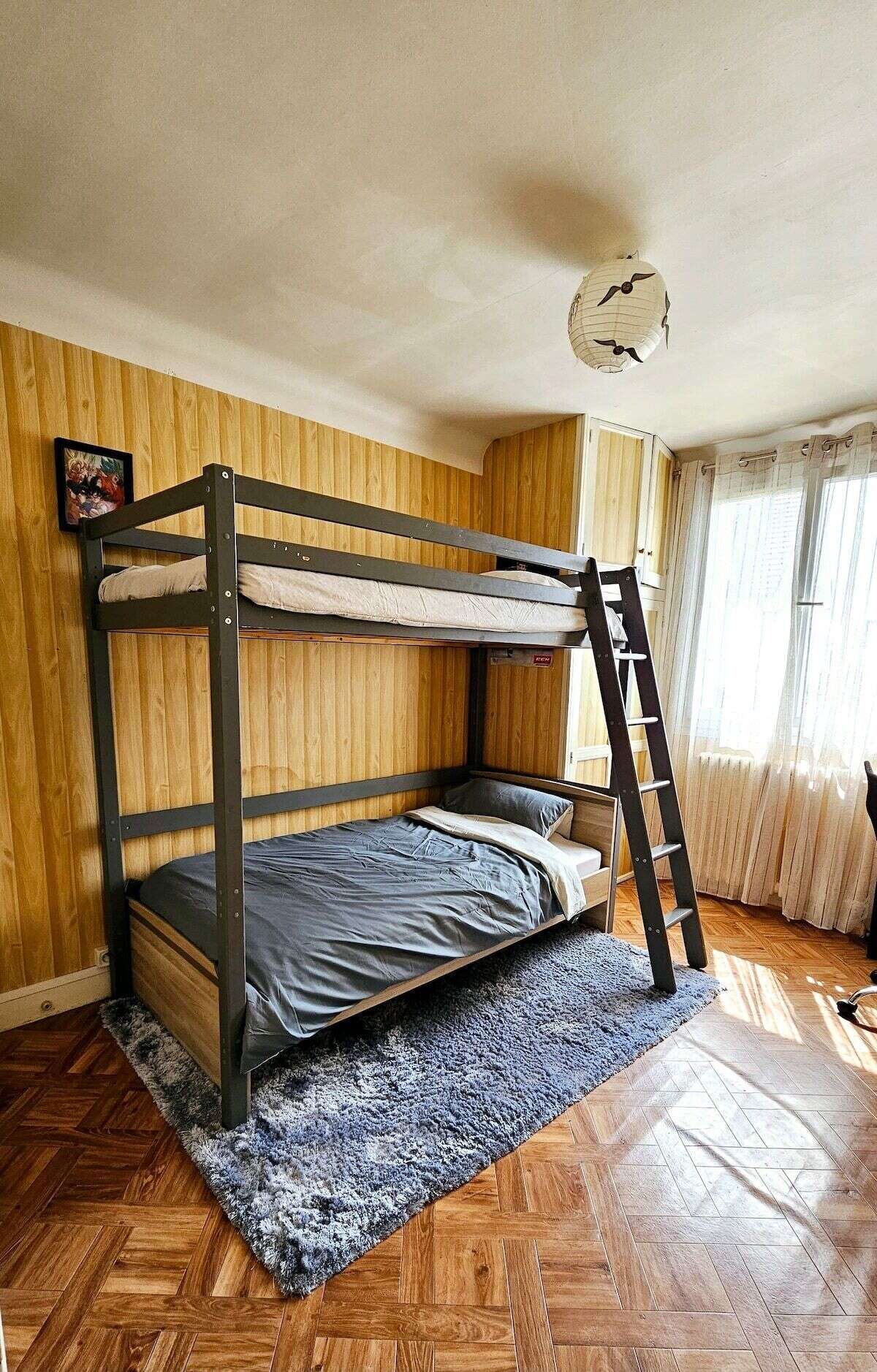 Elle comprend deux chambres : une avec un lit double et une autre avec un lit superposé (2 couchages), pouvant accueillir jusqu’à 4 personnes. Profitez du grand jardin extérieur équipé d’un salon de jardin, d’un trampoline pour les moments de détente ou de jeu, ainsi que d’un barbecue pour vos repas en plein air.